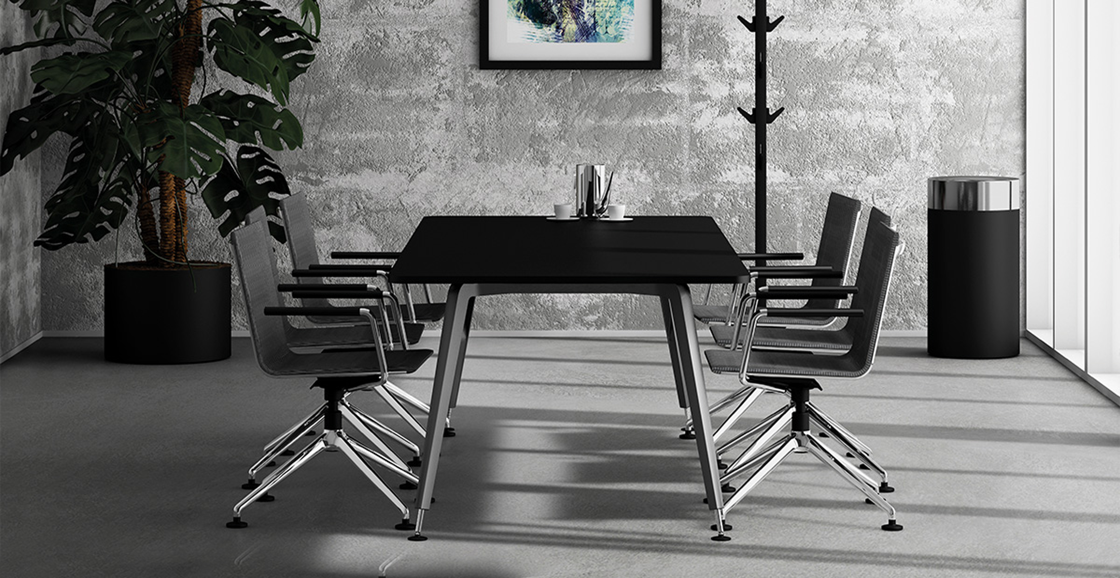 Die Firma Meier hat für diesen Zweck einen neuen Konferenzraum bekommen. Zentrales Objekt ist ein fünf Meter langer Tisch mit einer Blatte aus schwarzem Kirschholz, ein echte Unikat. Ruhend auf einem Untergestell aus gebürstetem Stahl, strahlt es Wärme, aber auch robuste Härte aus, so wie manche Verhandlung sein muss.